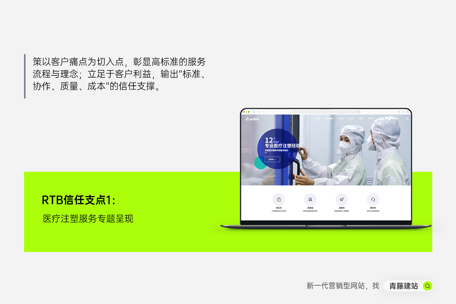 页面以banner“12年专业医疗注塑经验”开篇,开门见山引出目标访客痛点,给目标访客一个看下去的理由;