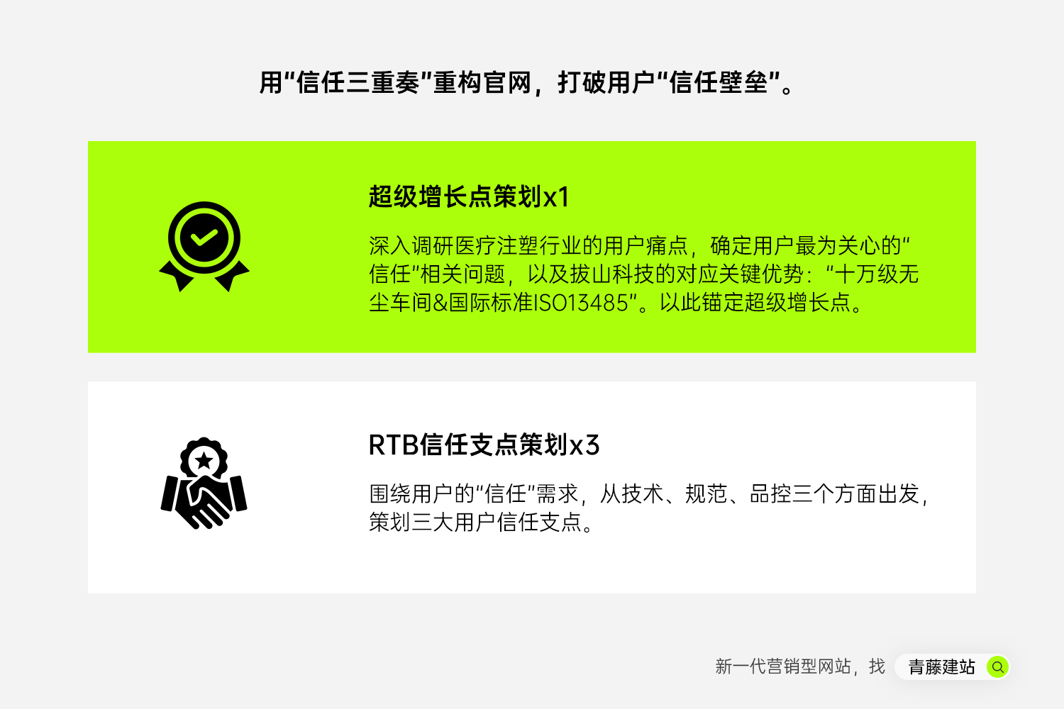 1. 锚定超级增长点:聚焦“行业刚需与企业优势交集”,将拔山科技所拥有的“10万级无尘车间+ISO 13485认证”作为超级卖点。我们判断,这既是医疗注塑的“入场资格”,也是同行难以快速复制的壁垒,还能串联设备、精度等其他优势,形成完整信任链;