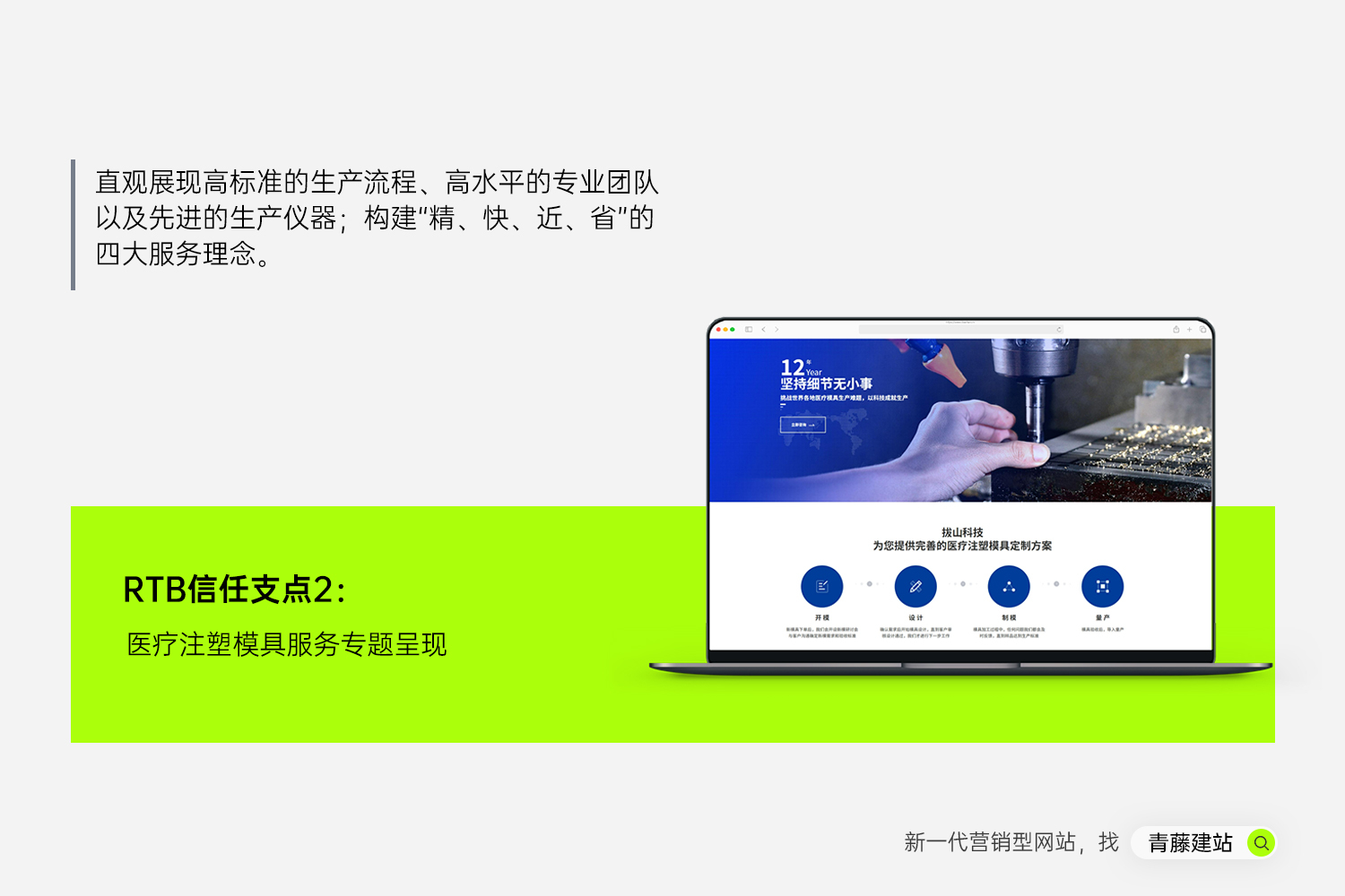 和【医疗注塑】以卖服务为主不同,【医疗注塑模具】是卖具象的产品,更强调硬实力。我们根据客户对模具生产专业可靠的核心诉求,以“技术细节”为核心,强化专业感知。
