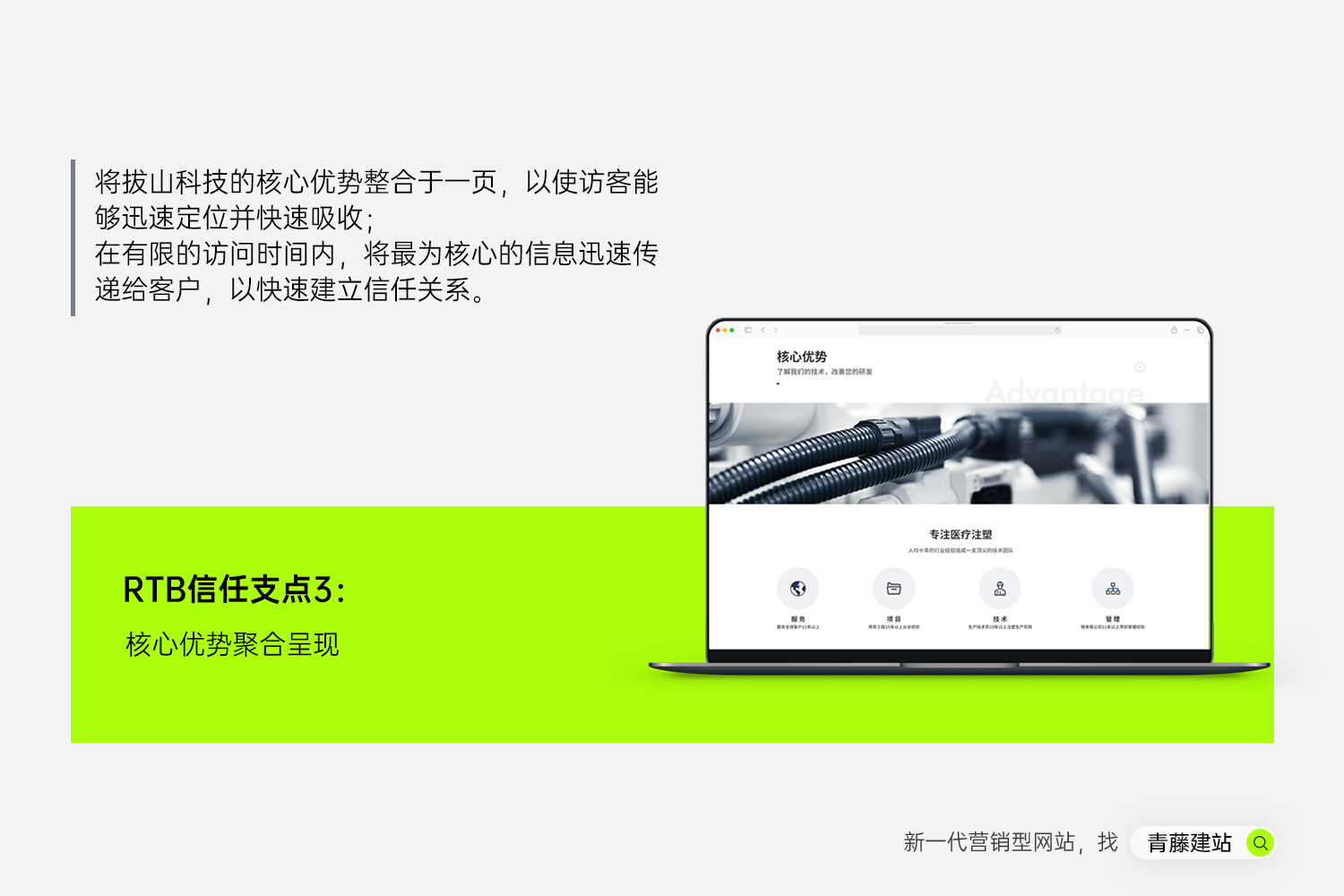 我们筛选拔山科技所有的优势信息,并且提炼总结,优先保留“客户一看就懂、一看就信”的内容,避免堆砌无关信息,用简洁的呈现方式提高信息传递效率;采用“大图+短句”形式,快速释放板块信息,客户可快速抓取核心信任点,无需进行进一步的自我吸收。