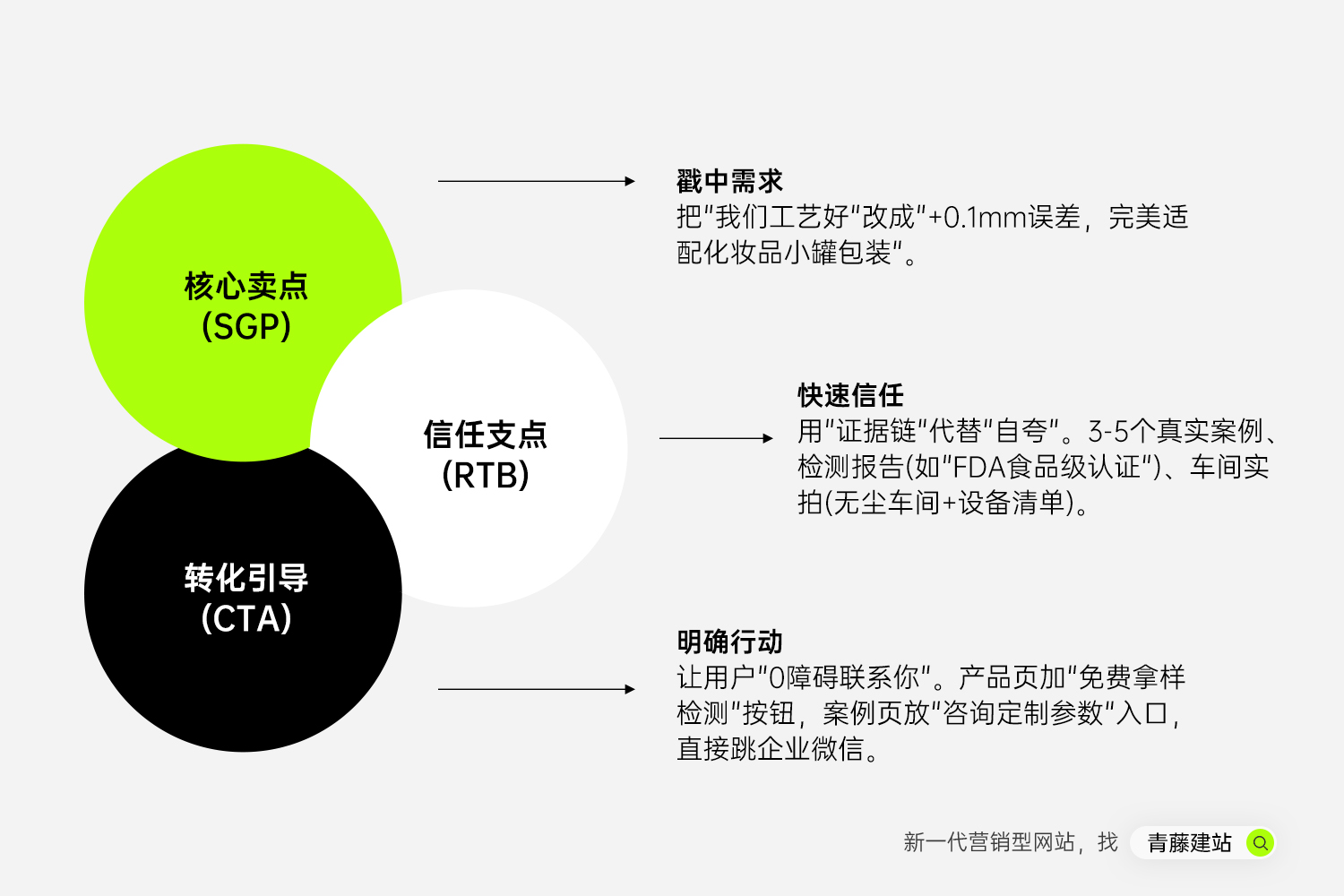 核心卖点(SGP):别喊口号,说清“能解决什么”。比如把“我们工艺好”改成“±0.1mm误差,完美适配化妆品小罐包装”;
