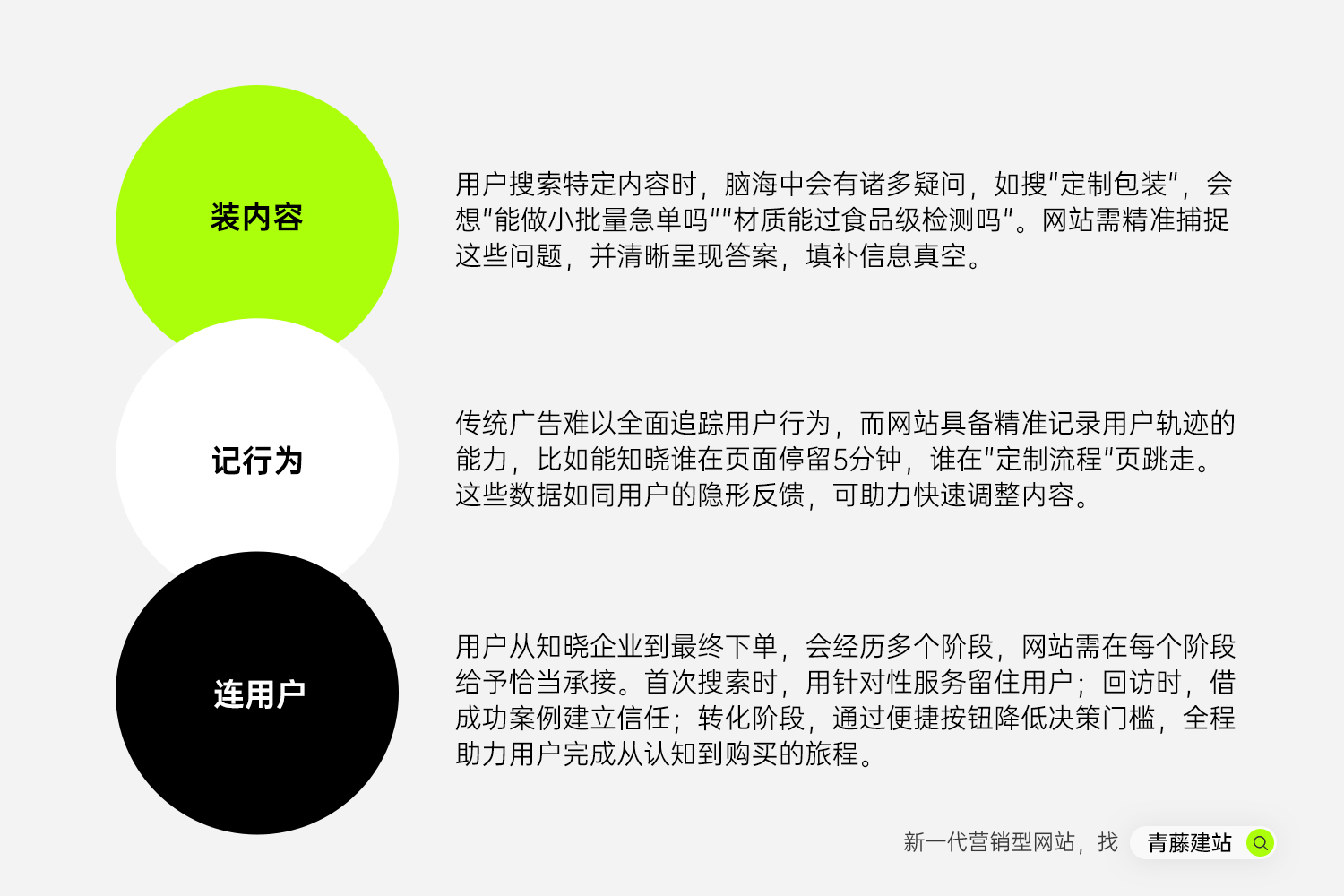 用户从“听说你”到“考虑你”再到“选你”,每一步,网站都“接得住”:第一次搜“包装厂”,用“小批量定制”让客户记住;深入浏览时,用某零食品牌复购案例建立信任;最后转化时,用“立即预约打样”按钮降低决策门槛。