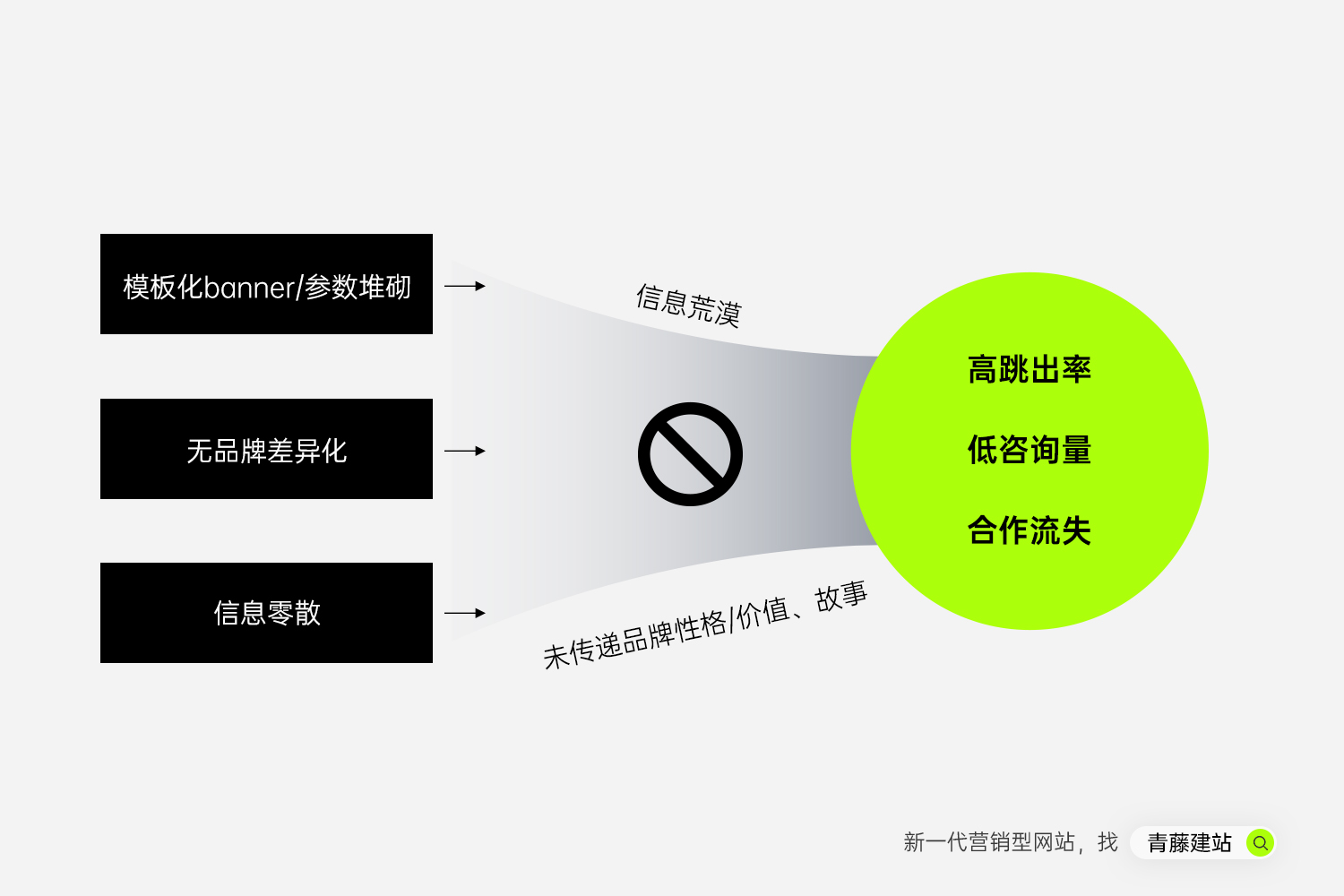 深究这种普遍的现象,可以总结为三点逻辑:其一,多数企业认为 “同行都这么做,就不会出错”,不愿突破既有框架探索差异化表达,最终陷入 “你抄我、我抄你” 的同质化循环;其二,在信息过载的当下,用户滑动屏幕的时间以秒计算,若官网传递的全是 “无差别信息”,就会被快速淹没在同类品牌中,导致 “看了等于没看”;其三,官网本应是品牌向用户传递 “独特价值” 的关键载体,但内容同质化让本该体现优势的信号,变成所有品牌共享的 “基础门槛”,无法帮用户区分 “你与别人的不同”。