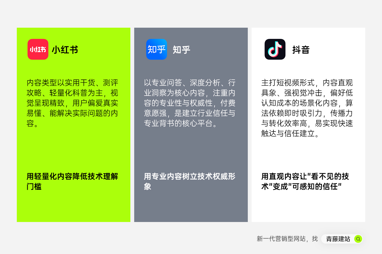 用户从“知道你”到“考虑你”,关键在于“能否信你”。此时,内容需要从“信息传递”升级为“信任构建”,除了官网,小红书、知乎、抖音等新媒体平台的内容生态,也天然适合考虑期的“场景化种草”与“技术可视化”。我们可以结合不同平台的不同特性,制作对口的官方内容,强化考虑期用户的信任。